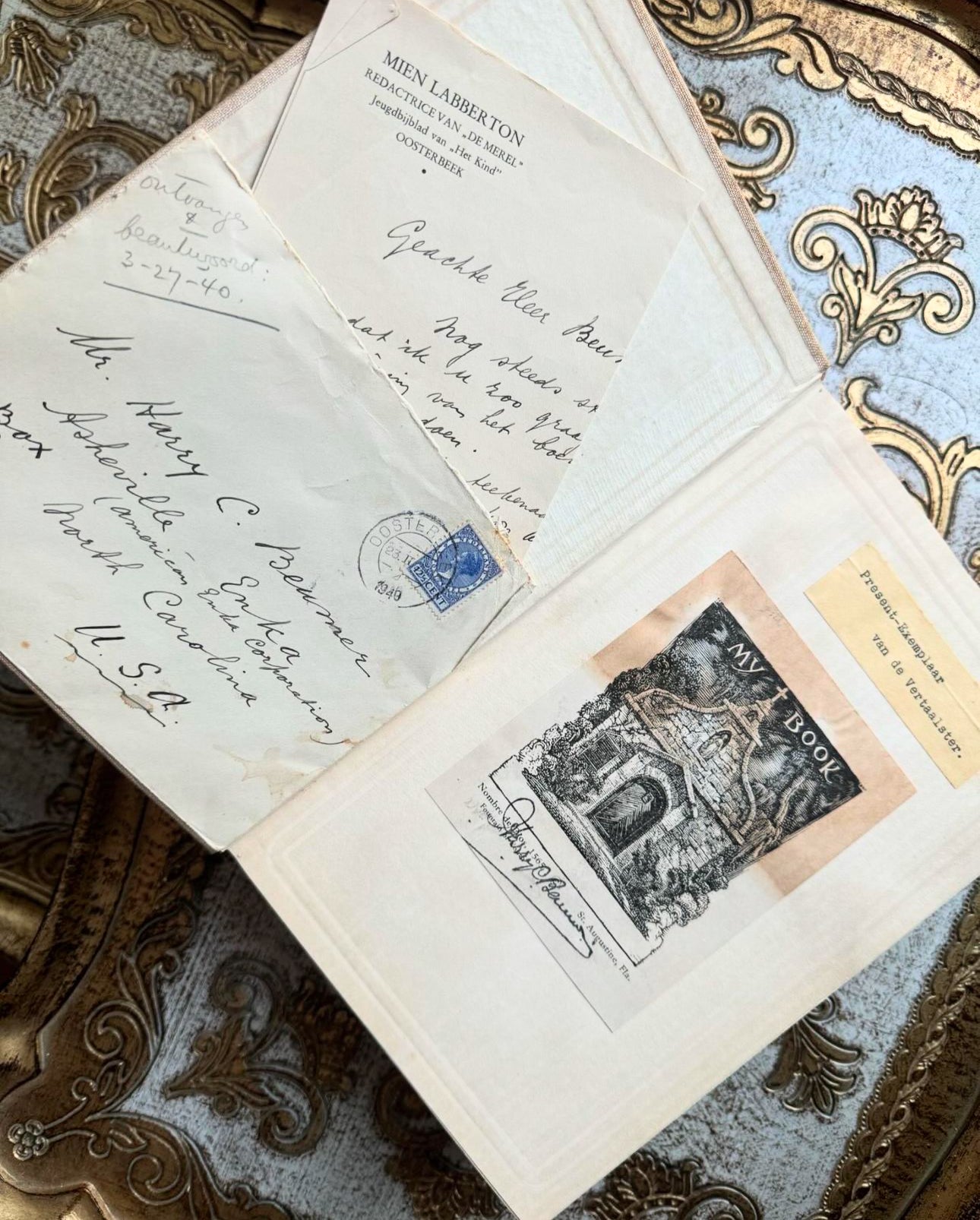 •”Present - Exemplaar Van de Vertaalster” (present copy from the translator) and bookplate pasted to endpaper